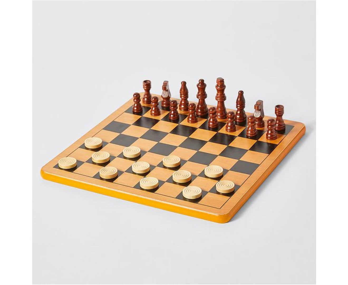 - Includes: 32 chess pieces, 24 checkers pieces, 1 solid wood game board, plus instructions.
